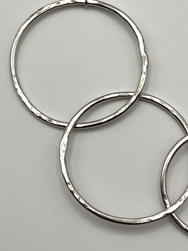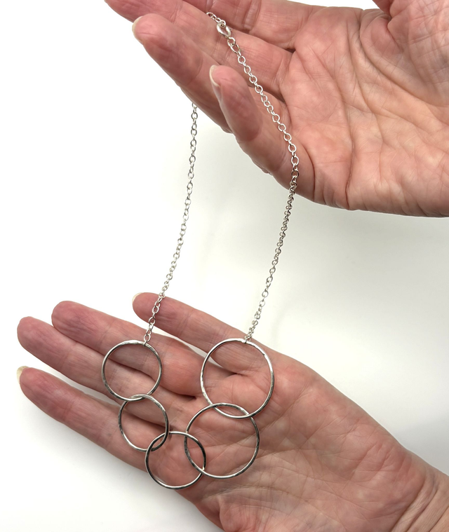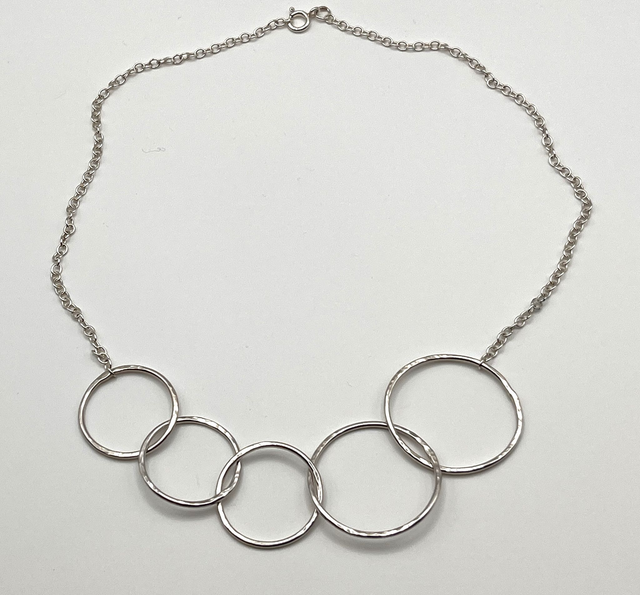 This asymmetrical sterling silver necklace features a sequence of textured circular loops joined in an off-centre arrangement. Each textured shape plays with light while lending a handcrafted finish.