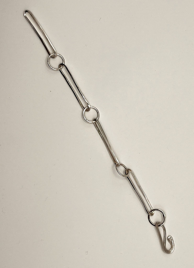 This sculptural bracelet features elongated links joined by circular connectors, creating an open geometric rhythm. Hand-forged in recycled silver, it's structured yet light.