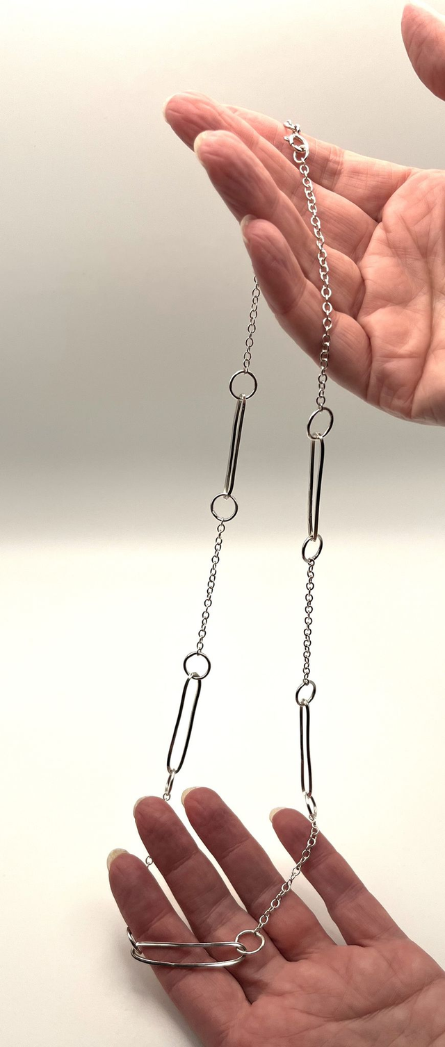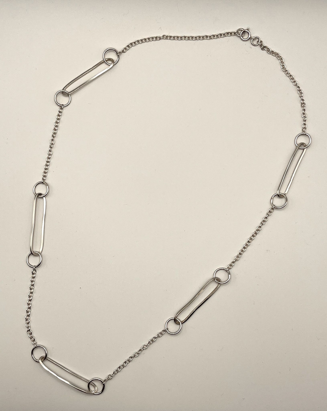 Refined and lightweight, this silver necklace brings clean geometry to your everyday style. Elongated links joined by circular connectors and fine chain create a soft modern rhythm.